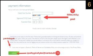 - وصلنا الى اخر خطوة وهى خطوة الدفع فى بلوهوست قم بكتابة بيانات البطاقة الائتمانية ثم اضغط على submit لاتمام عملية الدفع كما مبين فى الصورة .