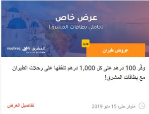 • وفّر 100 درهم على كل 1,000 درهم تنفقها على حجوزات الطيران مع بطاقات الخصم المباشر أو البطاقات الائتمانية من بنك المشرق!