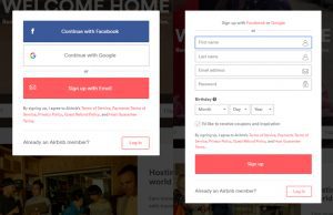 في بداية الأمر ندخل على هذا الموقع عبر الرابط www.airbnb.com أو عن طريق تحميل التطبيق الخاص بالموقع من المتاجر من خلال الهواتف الذكية ، و من ثم تقوم بالتسجيل و ذلك بالضغط على sign up أو بإمكانكم التسجيل بواسطة حسابك في Facebook.com أو انشاء حساب جديد في الموقع .