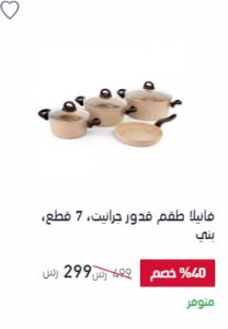 - تسوق الان من اكسترا السعودية مستلزماتك المنزلية – فانيلا طقم قدور جرانيت مكونه من اوانى و قليات 7 قطع متفاوته الاحجام و متنوعه لتناسب جميع الاستخدامات ، القدور بشكل انيق و مميز باللون البنى الفاتح و اغطية شفافه تمكنك من رؤية الطعام فلا داعى للكشف عنه بالاضافة الى ايادى تعزل الحرارة حتى لا تتضررى و من مميزاتها ايضاً انها تطهى الطعام بشكل جيد و بدون لصق للطعام و هى من المواد الامنه ، متوفره الان بسعر 299 ريال سعودى بدلا من 499 ريال سعودى خصم 40% .