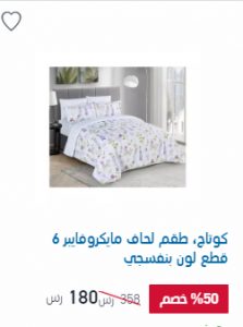 - تسوق الان من اكسترا السعودية مستلزماتك المنزلية – طقم لحاف مايكروفايبر مميز بشكل انيق و جذاب باللون البنفسجى مزين ببعض اشكال الزهور الرقيقه ، اللحاف يعطى شكل جميل الى غرفتك و يبقيك دافئاً طوال الوقت ، اللحاف مكون من 6 قطع من اللحاف و المخدات و يمكنك ايضاً استخدامه كمفرش للسرير ، السعر 180 ريال سعودى بدلا من 358 ريال سعودى خصم 50% .