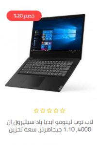 • تسوق الان من الصندوق الاسود لاب توب لينوفو ايديا باد سيليرون ان ideapad S145 GR-15IGM باللون الرمادى الراقى و سعة تخزين 1 تيرابايت بالاضافة الى مقاس شاشة 15.6 بوصة اتش دي و بدون ويندوز – 1.10 جيجاهرتز، سعة تخزين 1 تيرابايت، 4 جيجابايت رام، شاشة , و نظام تشغيل بدون  ويندوز، و يو اس بي و بلوتوث واى فاى ، السعر 799.00 ريال سعودى بدلا من 999.00 ريال سعودى و خصم 20% .
