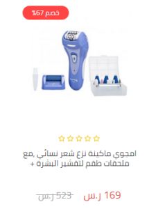 - بشرى للنساء من متجر الصندوق الاسود و الذى يوفر لكم ماكينة امجوي AP-14RP و التى تعمل على نزع الشعر النسائي من الجذور ، بالاضافة الى مجموعه لعمل تقشير للبشرة و العناية بالاظافر و تشكيلها ، هذه الماكينة لاغنى عنها للنساء فهى سريع و خلال دقائق ستكونى باطلاله متالقه بالاضافة الى تنعيم و تقشير البشرة و ازالة الجلد الميت ، السعر 169.00 ريال سعودى بدلا من 523.00 ريال سعودى و خصم 67% .