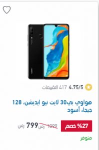 - تسوق من اكسترا السعودية – هواوي بي30 لايت نيو ايديشن- بشاشة رائعة 6.15 بوصة و شكل مثالى باللون الاسود و مساحة تخزين 128جيجابيت و كاميرا امامية 24 و كاميرا خلفية 48+8+2 ميجابكسل و يدعم شريحتين و بطارية 3340 ، الهاتف بسعر 799ريال سعودى بدلا من 1099 ريال سعودى خصم 27% .