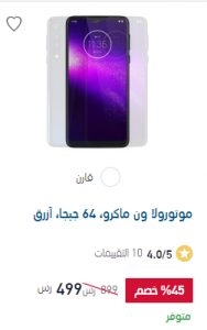 - تسوق بخصم 50% من اكسترا السعودية – جوال موتورولا ون ماكرو -يتميز الهاتف بخصائص تقنية عالية مثل ماسح البصمة بالاضافة الى بطارية 4000 مل أمبير و شبكة الاتصال الجيل الرابع و حجم شاشة 6.2 بوصة و معالج ثماني النواة و كاميرا امامية 8MP و كاميرا خلفية 13 + 2+ 2 ميجابيكسل و الهاتف يدعم شريحتين بمظهر انيق باللون الازرق ، الهاتف بسعر 499 ريال سعودى بدلا من 899 ريال سعودى و خصم 50% .