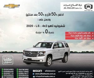 اشترى سيارة شيفرولية تاهو- 2020LS-4×2 و ادفع 50% الان و 50% بعد سنتين ، بالاضافة الى عازل حرارى و تلبيس دعاسات مجانا و حماية على حواف الابواب مجاناً و حماية على الانوار مجاناً ، هذا العرض سارى حتى 30 يونيو 2020 .