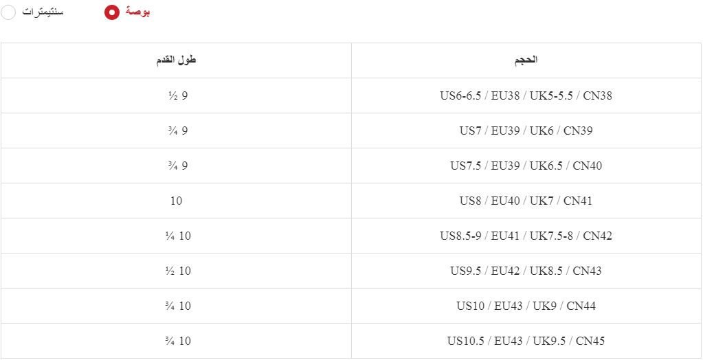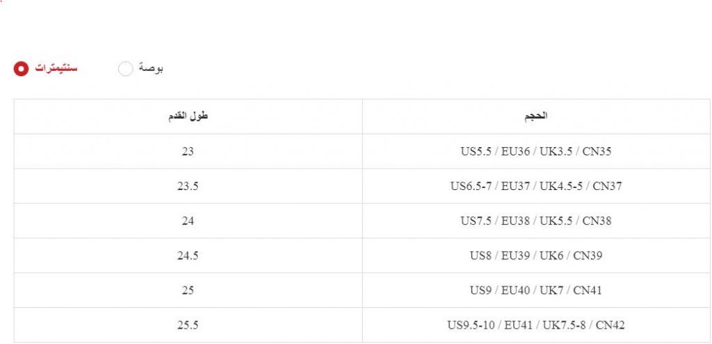 • والأحذية يقاس بالسنتمتر و البوصة.