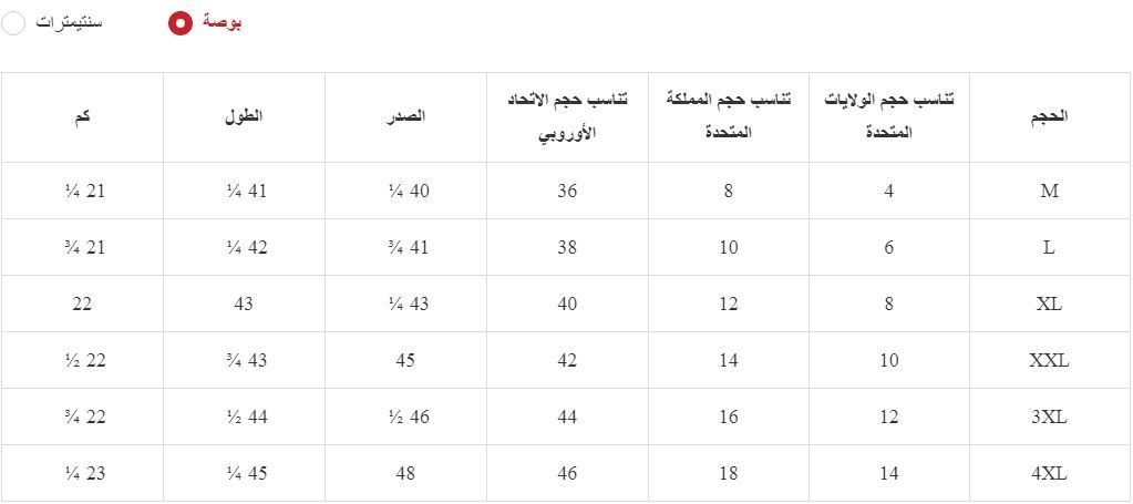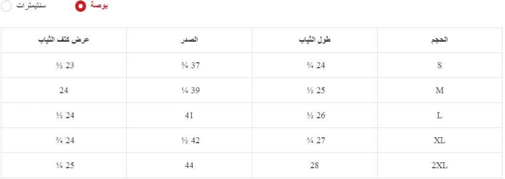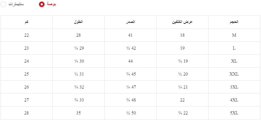 • التيشيرتات النسائية يقاس بالسنتمتر و البوصة.