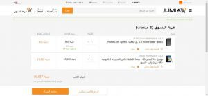 9- بعد الإنتهاء من التسوق أضغط على عربة التسوق من الجزء الأعلى في الصفحة ناحية الشمال سيظهر لك المنتجات التي قمت باختيارها ، (كما هو موضح بالصورة التالية) .